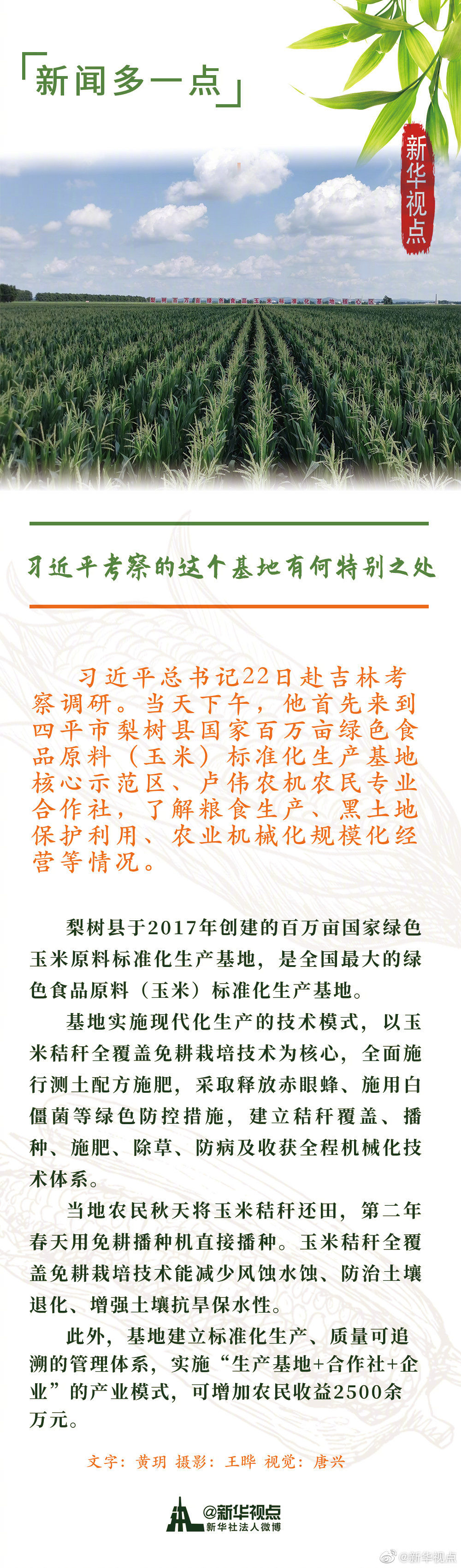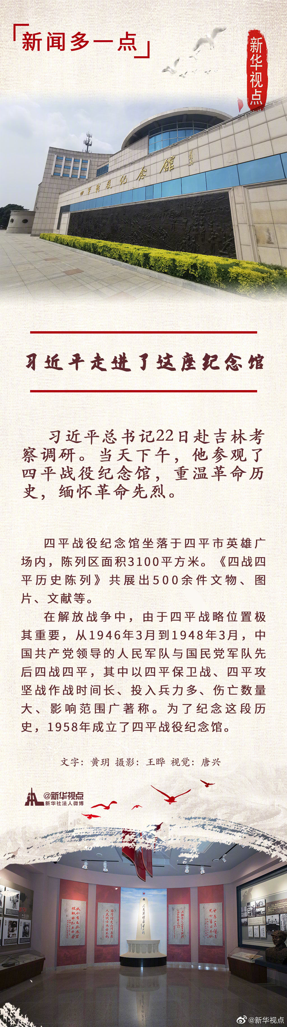 习近平总书记22日赴吉林考察调研。当天下午,他首先来到四平市梨树县国家百万亩绿色食品原料(玉米)标准化生产基地核心示范区、卢伟农机农民专业合作社,了解粮食生产、黑土地保护利用、农业机械化规模化经营等情况。随后,习近平参观了四平战役纪念馆,重温革命历史,缅怀革命先烈。(记者张晓松、朱基钗 摄影: 鞠鹏、王晔、燕雁)