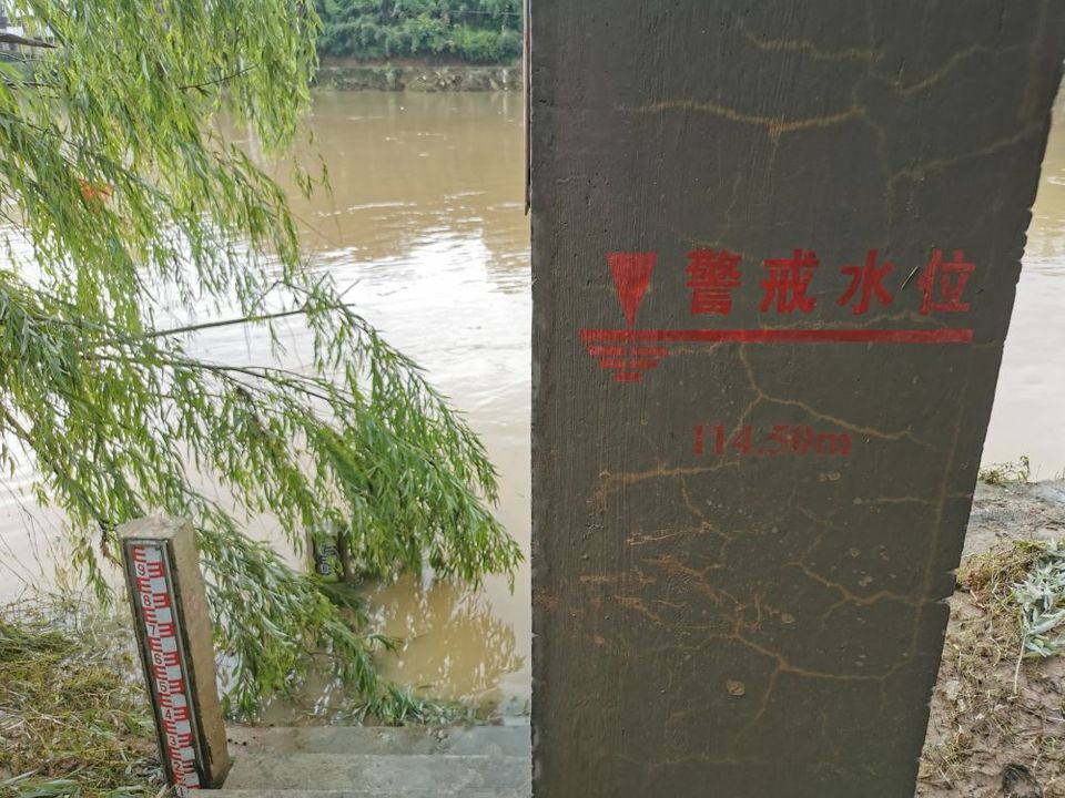 安徽省歙县渔梁水文站的下方基础柱上,用红色字体标记着警戒水位(7月9日摄)。记者姜刚 摄