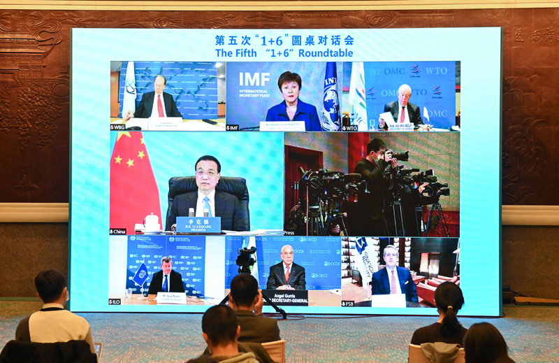 李克强表示,这是一次高效、成功的对话。我们讨论了世界经济形势,认为当前世界经济处于恢复过程中,仍面临较大不确定性。国际社会应加强合作,共克时艰,推动世界经济在今年经历严重衰退后,明年能够爬坡、上升,尽快走上稳定复苏轨道。我们一致同意坚持多边主义,维护多边贸易体制权威性有效性,维护全球产业链供应链稳定。贸易投资自由化、便利化是支持世界经济走出低谷的强大力量。着眼后疫情时代,中方愿在更大范围、更深层次上同主要国际组织加强合作,支持主要国际组织在全球治理体系中继续发挥重要作用,共同促进全球发展,增进各国人民福祉。